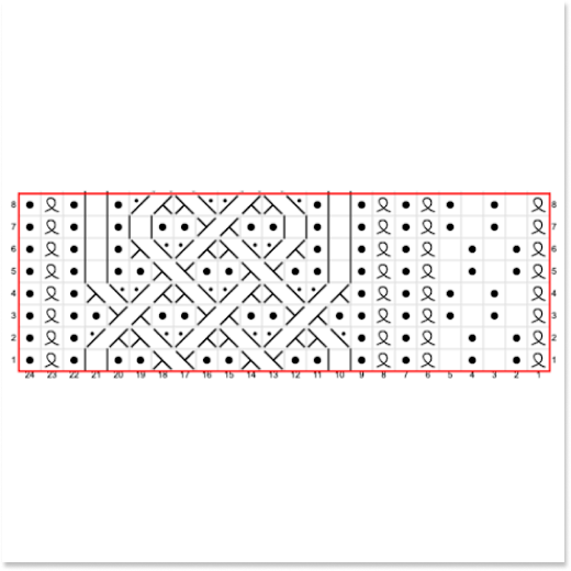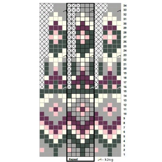 Продолжайте вязать по этой схеме и повторяйте узор A.1 х 3 раза в высоту. Высота шапки должна быть около 21 см, после чего вяжите оставшиеся ряды узором A.1, выполняя убавки и провязывая 78 петель узором A.2