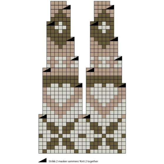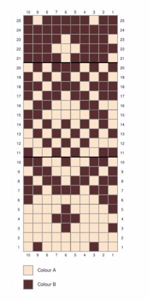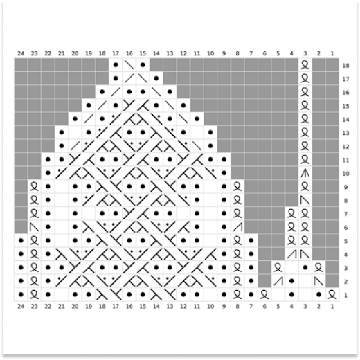 Ряд 18: провяжите все петли попарно вместе лицевыми = всего 22 петли (= 12 петель + петли узора A.1). Когда провяжете полный раппорт узора A.1, обрежьте нить, протяните ее через оставшиеся петли и закрепите.